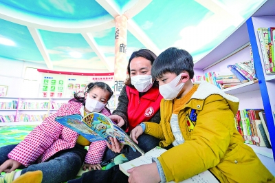 江蘇省海安高新區(qū)文化志愿者在農(nóng)家書屋里與留守兒童一起閱讀兒童讀物。翟慧勇攝/光明圖片