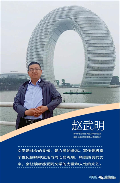 懷瑾握瑜,勤耕不輟。趙武明的寫作是安靜的,由于從事20余年的新聞工作,給他貯存了很多素材,所以他涉獵的寫作范疇很廣,寫散文隨筆、文藝評(píng)論、紀(jì)錄片、微電影、大型晚會(huì)總撰稿,還研究網(wǎng)絡(luò)文學(xué)。如果說文字是會(huì)呼吸的,趙武明的文字除了唯美,更多的是硬骨錚錚,也不乏柔腸的峻厲和倬約,風(fēng)姿獨(dú)具,淡雅濃烈,相得益彰,簡(jiǎn)約獨(dú)立,一語千里,蘊(yùn)含張力。他常說,寫作要穿透人心抵達(dá)靈魂。向外,不斷追求生命更高的境界;向內(nèi),不斷觸及心靈。