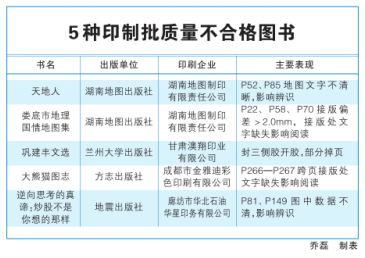 8家印制批質量不合格單位的具體查處情況為:方志出版社、地震出版社、湖南地圖出版社、蘭州大學出版社等4家出版單位受到警告的行政處罰;廊坊市華北石油華星印務有限公司、湖南地圖制印有限責任公司、成都市金雅迪彩色印刷有限公司、甘肅澳翔印業(yè)有限公司等4家印刷企業(yè)受到警告的行政處罰。