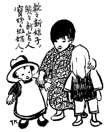 子愷先生藝術(shù)之獨(dú)特在另一方面——獨(dú)樹高標(biāo),表現(xiàn)童心童趣,抒情融入詼諧,展示了一種美學(xué)境界。此類經(jīng)典之作大多收集于《兒童相》。令人過(guò)目不忘者如畫孩子持兩蒲扇,一前一后,作騎馬狀,題曰“瞻瞻的腳踏車”;孩子將自己的鞋子墊于四腳圓凳之下,題曰“阿寶兩只腳,凳子四只腳”。于兒童經(jīng)驗(yàn)之局限寫其心靈之天真,于不起眼的、平常人視之無(wú)所謂的現(xiàn)象中發(fā)現(xiàn)童心之美。還有一幅令人印象深刻,三個(gè)孩子,一女稍高,立于中,左側(cè)男孩,戴英式禮帽,甚大,右側(cè)女孩,頭蒙面布,題曰“軟軟新娘子,瞻瞻新官人,寶姊姊做媒人”。其事極不現(xiàn)實(shí)而孩子極慎重,于兒童顯示童心童趣,于畫則表現(xiàn)了先生的愛心和幽默。