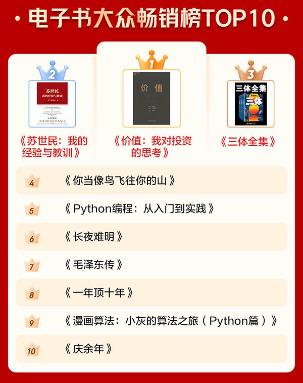 通過電子書暢銷榜TOP10和有聲暢銷榜TOP10可以看出,很多人愈發(fā)關(guān)注投資和管理等方面的內(nèi)容,也愈發(fā)注重個(gè)人學(xué)習(xí)?!秲r(jià)值:我對(duì)投資的思考》《蘇世民:我的經(jīng)驗(yàn)與教訓(xùn)》 分別位居電子書暢銷榜第一名和第二名?!吨袊?guó)經(jīng)濟(jì)2020》《原則》進(jìn)入有聲暢銷榜前十。此外,學(xué)習(xí)類圖書《Python編程:從入門到實(shí)踐》《漫畫算法:小灰的算法之旅(Python篇)》也上榜電子書暢銷榜前十。