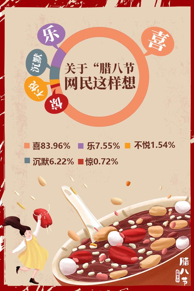 雖然今年多地的臘八節(jié)活動(dòng)因疫情而取消,但是人們對(duì)于團(tuán)圓、祥和、富裕、康寧、平安的期盼從未改變。有關(guān)“臘八”的網(wǎng)民情緒分布中,“喜”占83.96%,“樂”占7.55%。總體來說,開心喜悅的情緒占到了九成以上。