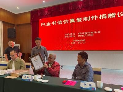 捐贈(zèng)儀式由四川省作協(xié)黨組書(shū)記侯志明主持,省作協(xié)主席阿來(lái)致辭。省作家協(xié)會(huì)向李致頒發(fā)了收藏證書(shū)。詩(shī)人黎陽(yáng)現(xiàn)場(chǎng)朗誦了巴金大哥寫(xiě)給巴金一封信的選段,內(nèi)容充滿情感,令人動(dòng)容。朱丹楓、廖全京等文藝界人士,以及巴金多位親屬出席了捐贈(zèng)儀式。