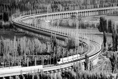 伴隨改革開放大潮,中國發(fā)展日新月異,高鐵、快遞、“天眼”望遠(yuǎn)鏡、粵港澳大橋等新事物都被詩人們?nèi)谌朐娦?。圖為行駛中的蘭新高鐵列車。新華社發(fā)(蔡增樂攝)