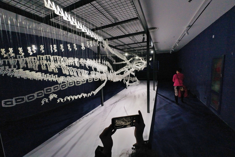 2022年1月3日,天津國圖·津灣文創(chuàng)空間舉辦,甲骨文創(chuàng)意展,一名參觀者用手機拍攝甲骨文懸空雕塑。 中新社記者 佟郁 攝