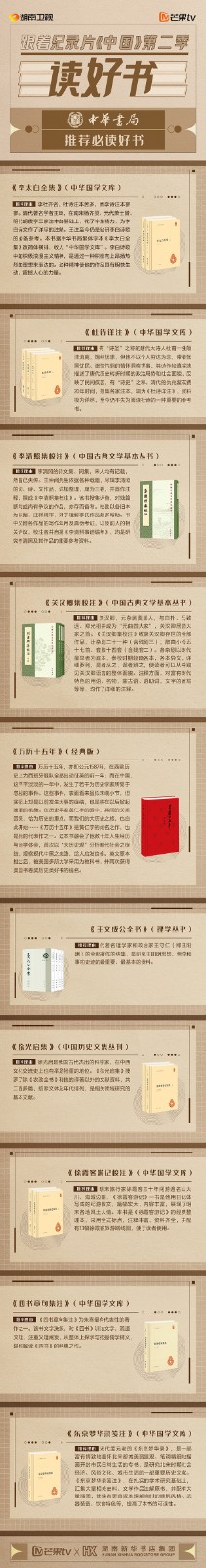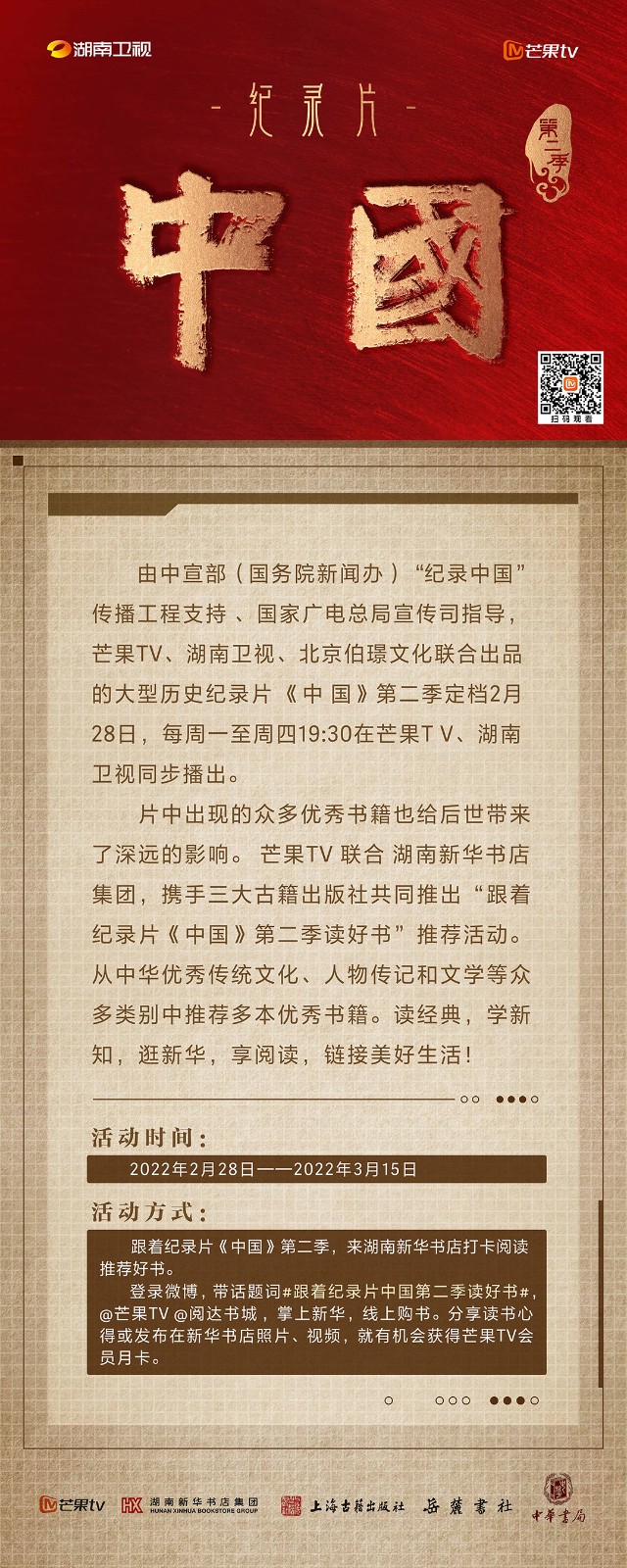 芒果TV以紀(jì)錄片《中國(guó)》第二季的精美品質(zhì),聯(lián)合湖南新華書(shū)店集團(tuán)的美譽(yù)口碑,將中華書(shū)局、上海古籍出版社、岳麓書(shū)社推薦的珍品好書(shū),傾情向大眾推薦。本次“跟著紀(jì)錄片《中國(guó)》第二季讀好書(shū)”活動(dòng),將從2月28日持續(xù)到3月15日,湖南新華書(shū)店集團(tuán)旗下湖南圖書(shū)城、不吝Boolink書(shū)店、全省市級(jí)中心門店、長(zhǎng)沙地區(qū)樂(lè)之書(shū)店等全員參與,推薦紀(jì)錄片《中國(guó)》第二季。書(shū)友及觀眾可登錄微博或到線下門店打卡參與活動(dòng)。