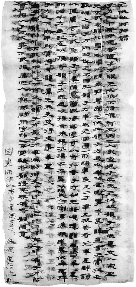 子方足下,善毋恙!苦道子方發(fā),元失候不侍駕,有死罪。丈人、家室、兒子毋恙,元伏地愿子方毋憂。丈人、家室元不敢忽驕,知事在庫,元謹奉教。暑時元伏地愿子方適衣、幸酒食、察事,幸甚!謹?shù)溃簳?dāng)從屯敦煌,乏沓,子方所知也。元不自外,愿子方幸為元買沓一兩,絹韋,長尺二寸;筆五枚,善者,元幸甚。錢請以便屬舍,不敢負。愿子方幸留意,沓欲得其厚、可以步行者。子方知元數(shù)煩擾,難為沓。幸甚幸甚!所因子方進記差次孺者,愿子方發(fā)過次孺舍,求報。次孺不在,見次孺夫人容君求報,幸甚,伏地再拜子方足下!所幸為買沓者,愿以屬先來吏,使得及事,幸甚。元伏地再拜再拜!