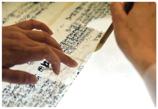▲5月17日,在安徽博物院文物科技保護(hù)中心紙質(zhì)文物修復(fù)室,工作人員對(duì)古籍文物進(jìn)行補(bǔ)全。新華社記者周牧攝