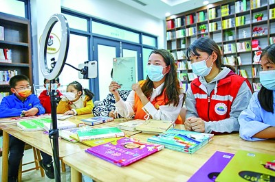 在江蘇如皋市如城街道顧莊社區(qū)農(nóng)家書屋內(nèi),志愿者通過網(wǎng)絡(luò)平臺為學生推薦好書。徐慧攝/光明圖片