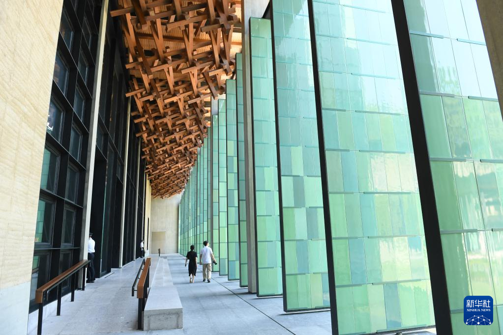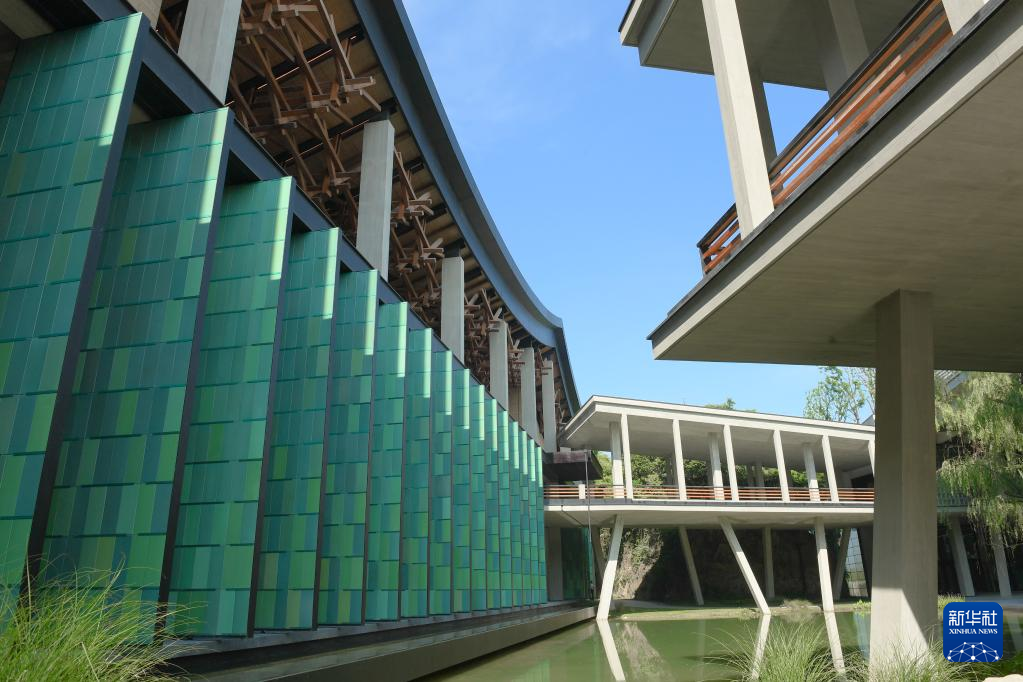 杭州國(guó)家版本館屋頂?shù)哪緲?gòu)和青瓷門(mén)扇相映成趣(7月23日攝)。