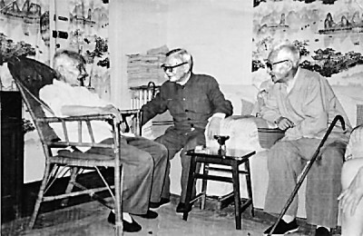 1982年7月7日下午,朱光潛(左)、茅以升(中)、宗白華三位老學者在朱光潛家會面談心 資料圖片
