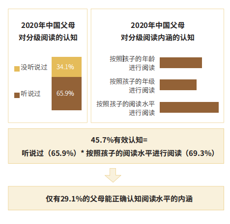 雖然分級閱讀已經(jīng)成為國際公認的閱讀趨勢,可是,從當當聯(lián)合艾瑞發(fā)布的《2020年中國K12階段學生“分級閱讀”白皮書》(以下簡稱《白皮書》)中,我們發(fā)現(xiàn)中國大部分父母對于分級閱讀尚缺乏認識,更談不上有足夠的重視?!栋灼分赋觯?5.9%的父母聽說過“分級閱讀”,而其中真正了解“分級閱讀”的父母只占45.7%。