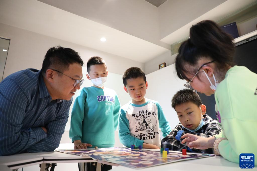 4月1日,在甘肅省蘭州市的讀者出版集團(tuán)數(shù)字閱讀中心讀者小站,工作人員與小朋友一起玩“講述中國神話故事”的飛行棋游戲。新華社記者 馬希平 攝
