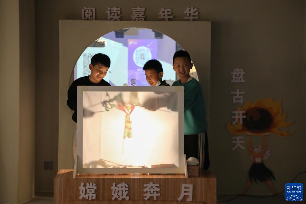 4月1日,在甘肅省蘭州市的讀者出版集團(tuán)數(shù)字閱讀中心讀者小站,小朋友體驗(yàn)中國神話故事主題皮影戲。新華社記者 馬希平 攝