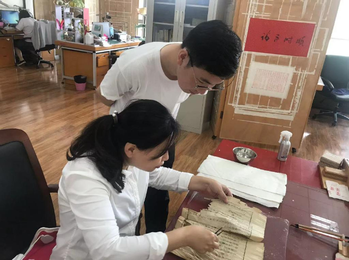 “古籍修復(fù)容不得任何失誤。每一道工序都要小心翼翼、屏息凝神。”王斌說(shuō),每拿到一本古籍,修復(fù)師首先要查看并記錄破損情況,同時(shí)制定修復(fù)方案,再根據(jù)方案對(duì)古籍進(jìn)行清洗、配紙、修補(bǔ)、錘平、修剪、壓實(shí)、裝訂……整個(gè)過(guò)程前后有幾十道繁瑣工序。