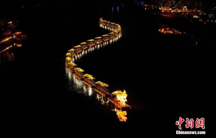 資料圖:一條200米長(zhǎng)的水上金龍?jiān)诎不帐↑S山市休寧縣齊云山鎮(zhèn)橫江江面上游弋而過(guò),龍燈迤邐,與江畔的古民居夜色相映成輝,喜迎新春。施亞磊 攝