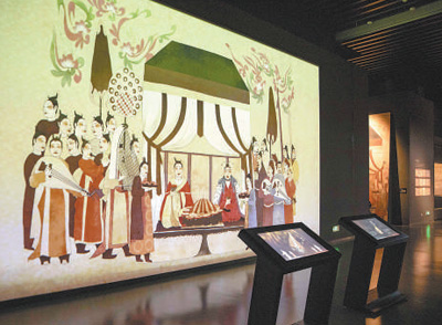 徐顯秀墓北壁壁畫《宴飲圖》互動投影墻。人民網(wǎng)記者 王 帆攝