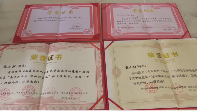 一分耕耘,一分收獲,機(jī)會總給有心人。如今,張小紅加入了靖遠(yuǎn)縣作家協(xié)會、白銀市作家協(xié)會、白銀市文藝評論家協(xié)會成為了會員,也增選為靖遠(yuǎn)縣政協(xié)委員。她的作品散見于《白銀文學(xué)》《烏蘭》等報刊雜志以及“靖遠(yuǎn)作協(xié)”“隴上風(fēng)情”“黃土情文學(xué)”等文學(xué)公眾號;部分作品榮獲靖遠(yuǎn)縣建黨100周年“學(xué)黨史頌黨恩·述成績謀發(fā)展”征文二等獎,“喜迎二十大·教壇著華章”《未來導(dǎo)報》有獎?wù)魑膬?yōu)秀獎等……