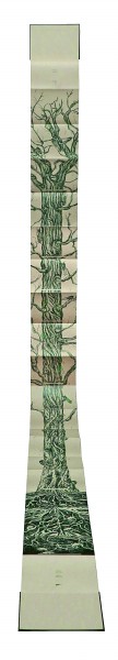 除了材料語(yǔ)言的拓展,展覽中的許多作品還展現(xiàn)出設(shè)計(jì)形式的創(chuàng)新與突破。如陳潔瑩的《蟬鳴樹語(yǔ)》聚焦了蟬絢爛而短暫的生命軌跡。書籍的裝幀方式采用經(jīng)折裝,當(dāng)書本徐徐展開,一棵參天古樹好似拔地而起,貫通全書首尾。由樹根處為起點(diǎn)向上閱讀直至樹冠,可見(jiàn)蟬從卵枝到若蟲,再經(jīng)歷脫殼變?yōu)槌上x的歷程。經(jīng)由巧妙的形式設(shè)計(jì),生命的輪回在書頁(yè)間流轉(zhuǎn),詮釋出動(dòng)人的自然之力。