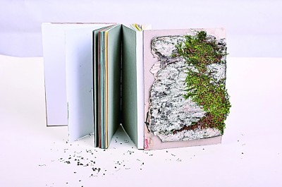 值得一提的是,上述書籍中有許多僅容納了少量文字信息,甚至完全脫離了文本的限制,藝術(shù)家僅借“書”的形式與面貌來(lái)傳遞自己的所思所感。這類作品既是書籍,也可看作獨(dú)立的藝術(shù)裝置,呈現(xiàn)出書籍裝幀與其他藝術(shù)門類相互融合的發(fā)展趨勢(shì)。