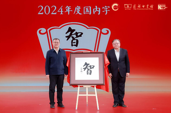 新華網(wǎng)黨委常委、總編輯車玉明(左),商務(wù)印書館黨委書記、執(zhí)行董事顧青(右)揭曉年度國內(nèi)字“智”。新華網(wǎng) 發(fā)