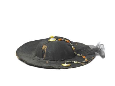 這一頂鑲寶石鈸笠帽,可要豪華貴重得多,這是一頂帽頂垂有一串玉石珠串飾的帽子,帽的直徑有35厘米?!洞笤湔隆吩涊d有人搶走蔡國(guó)祥懸有紅瑪瑙珠串的棕帽的事。可見(jiàn)帽上垂串飾也是元代貴族的風(fēng)氣。這種帽子的流行始于元成宗大德年間(1297—1307),一個(gè)商人賣給官府一塊紅剌子(紅寶石)重一兩三錢(qián),用于鑲嵌帽頂。從此以后,歷代皇帝相承。凡元旦及天壽節(jié)大朝賀時(shí)都戴這種鈸笠帽。漳縣元代汪世顯墓出土的這頂鈸笠帽,帽頂鑲金裹玉,由帽頂垂系31顆珠玉組成的串練。以珠玉寶石來(lái)裝飾帽子,帽子的價(jià)值之高昂自不待言。