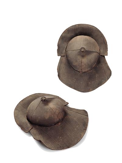 先看前加沿笠帽,大家看是不是有些眼熟?沒(méi)錯(cuò),這頂帽子與影視劇中英雄俠客們所戴的帽子很相似,《神探狄仁杰》里的李元芳、《水滸》中的林沖外出時(shí)就戴類似的帽子。為什么要戴這樣的加沿笠帽呢?為了遮光啊。別小瞧這頂前加沿笠帽,它的背后還有一段歷史故事呢:相傳元世祖忽必烈騎馬射獵時(shí)覺(jué)得日光太過(guò)炫目,聰慧體貼的皇后便為他設(shè)計(jì)了這種前面加沿的帽子,戴這種加沿帽遮光效果就好多了,忽必烈非常喜歡,便將這種式樣固定了下來(lái),以后國(guó)人紛紛效仿,成為流行款式。可是,唐宋是在元之前,元芳和林沖似乎不該戴類似的帽子?既是藝術(shù)形象,就不用深究了吧。人類智慧相通,英雄更是惺惺相惜,既都是英雄,戴上同款的帽子也是應(yīng)有之義。