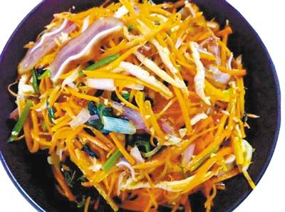 ● 做法:以地產(chǎn)蔬菜胡蘿卜、菠菜和綠豆芽,搭配耳絲、口條、肝片而成,色澤明快、微酸適口:胡蘿卜絲用少許鹽腌至脆柔、綠豆芽焯水保持白嫩、綠菠菜焯過捏去水分切成寸段,這三樣食材搭配營養(yǎng)成分暫且不說,單就紅、白、綠三色,就足夠醒目了。正宗的天水酒碟還要配以鹵豬耳、豬肝和煮熟的拆骨肉,最后點綴以綠綠的香草。