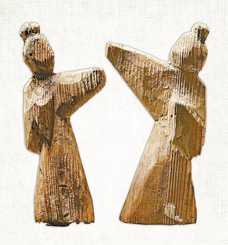 武威磨嘴子漢墓出土,現(xiàn)藏甘肅省博物館的兩件彩繪木舞蹈俑,其中一件寬4.9厘米,厚3.5厘米,高26.7厘米。木俑梳高髻,著長(zhǎng)袍,身體向右傾斜,左臂置于胸前,右臂舉起,頭微側(cè),作舞蹈狀。另一件木俑底寬5.4厘米,高14.5厘米,削制而成。以黑、紅兩色繪五官和衣領(lǐng)等。木俑挽高髻,穿袍服。左臂撫胸,右臂向前上舉起,身子傾斜,作舞蹈狀。它們和同一地點(diǎn)出土的漆樽舞蹈畫(huà)一樣,都是現(xiàn)實(shí)生活中官僚貴族富戶(hù)舞伎的藝術(shù)再現(xiàn)。