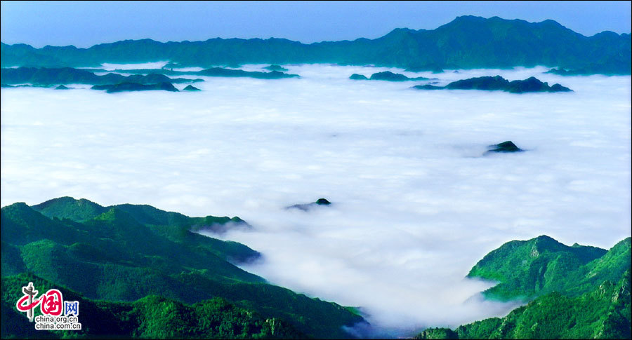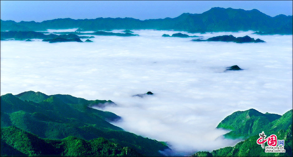 暖濕空氣上升到一定高度,遇冷凝結(jié)成云霧,形成霧靈山變幻莫測、波瀾壯闊的霧靈云海。云海在無風(fēng)之際是出奇的平靜,輕風(fēng)吹過,濺起層層浪花。風(fēng)勢稍強(qiáng),便似波濤洶涌,又如萬馬奔騰,置身山巔,神思飛越,浮想聯(lián)翩,仿佛進(jìn)入夢幻世界。站在頂峰遠(yuǎn)眺,山巒在云海中出沒無常,宛若大海中的無數(shù)島嶼,時隱時現(xiàn),似真似幻,使人感到一種神奇縹緲的仙境般的美。云海中的景物若隱若現(xiàn),虛虛實實,令觀者捉摸不定,于是產(chǎn)生幽邃、神秘、玄妙之感,給人一種朦朧的美。從美學(xué)角度觀察,霧靈云海妙在似海非海,非海似海。其潔白云霧的飄蕩,使霧靈山呈現(xiàn)出靜中寓動的美感。正是在這種動靜結(jié)合之中,造化出變幻莫測,氣象萬千的人間仙境。