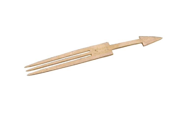 再看一柄骨叉,這柄骨叉同樣是齊家文化時期的產(chǎn)物,距今有4000年之久了,若不是文物標明年代,真不敢相信它是數(shù)千年前的先民所制。這柄骨叉長15.8厘米、寬1.8厘米、厚0.2厘米,叉部呈長方形,尖端為三齒,細長方形柄,柄端呈三角形。去掉柄端的三角造型,這柄骨叉與現(xiàn)在餐桌上的叉子有什么分別呢?最難得的是,這柄骨叉制作得如此規(guī)整,打磨得這般光滑,想想看,它可是新石器時代先民的手工活,制作竟如此精美,真令人嘆服!