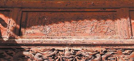 牌坊正面左右次樓嵌板上刻橫聯:師孔成仁絜孟取義如水行地若日在天。為1918年,民國戊午年所刻,無落款。楹聯內容是:客居張掖民勤商賈立足異鄉(xiāng)的道德準則,和做人做事的行為勉勵。牌坊背面嵌板刻:“膏流瀚海”,無作者書家落款。“膏流”意寓恩澤;“瀚海”則指民勤以北浩瀚如海的騰格里沙漠和巴丹吉林沙漠。