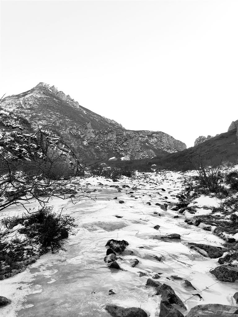 穿過(guò)公路就來(lái)到露骨山腳下,山間灌木叢生,枯葉凋零,一夜的小雪也使天空更加清澈。上山的路,總體是溯溪而上,不過(guò)腳下的小溪已經(jīng)變成冰河,但潺潺水聲不時(shí)在耳邊響起,大小石塊橫亙?cè)诒又?,白雪覆蓋其間,我們一行沿著前人在雪地留下的腳印,撥開齊胸的灌木枝,深一腳淺一腳、兜兜轉(zhuǎn)轉(zhuǎn)向前行。