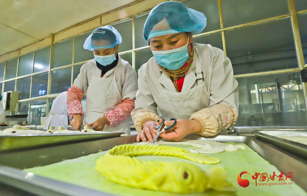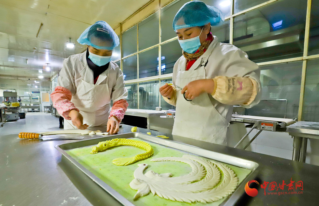 1月6日,甘肅民樂縣隴上鄉(xiāng)村農(nóng)業(yè)科技公司鄉(xiāng)村饃饃加工車間里員工正在精心制作“龍鳳呈祥花饃饃”。