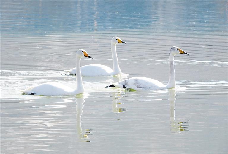 近日,永靖縣鹽鍋峽鎮(zhèn)境內(nèi)的黃河八盤峽水庫成為天鵝等候鳥越冬的樂園,它們在此棲息、覓食,成為冬日黃河里的一道靚麗風景。 本報記者 史有東 攝