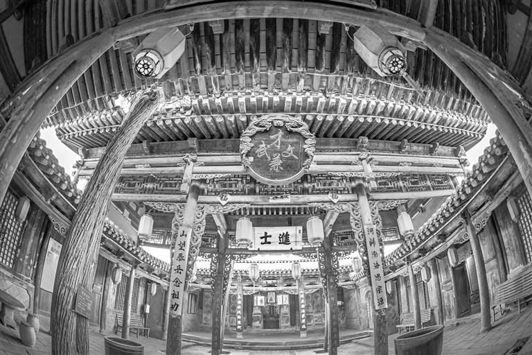 在這里,八仙桌上擺著的文房四寶,依然還飄著淡淡的墨香;墻上的字畫栩栩如生,筆走龍蛇,令人贊嘆;木門、木窗、木桌、木凳,簡樸溫厚如謙謙君子;高懸的匾額,穿透久遠的歲月,看著它們,仿佛在與歷史對話;抬頭可以看到,這里的椽子是方形的因為這里是給學(xué)生立規(guī)矩傳授知識的地方,梁和柱子都是圓形的,印證了“無規(guī)矩不成方圓”的道理。