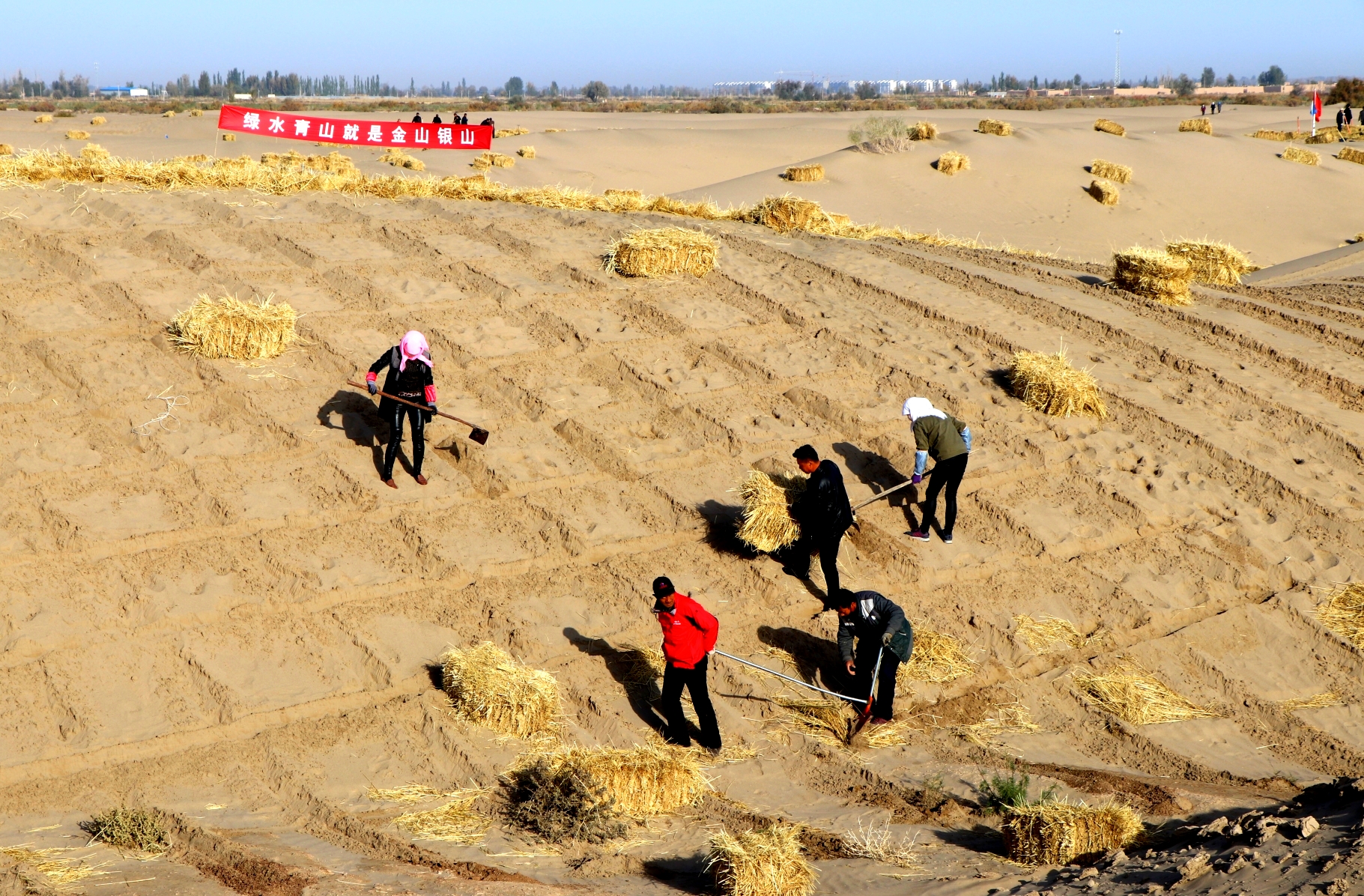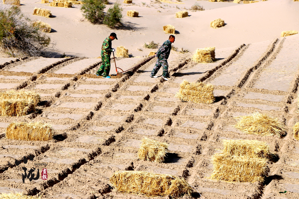 棉花稈、芨芨草、砂礫石、尼龍網(wǎng)、土工編制袋、粘土沙障、化學固沙等治沙新技術提高了治理效率。