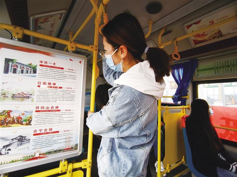 黨史學(xué)習(xí)教育主題車廂的車體外部掛有醒目的黨史宣傳標(biāo)語,走進(jìn)車廂,風(fēng)道展板上以黨史故事的形式,圖文并茂、生動(dòng)形象地展示著紅船精神、井岡山精神、長征精神、遵義會(huì)議精神、延安精神、西柏坡精神、抗美援朝精神、戰(zhàn)疫精神等內(nèi)容。車廂內(nèi)的座椅靠背、宣傳欄等處也印有不同的黨史宣傳知識,公交車廂成了黨史學(xué)習(xí)教育的流動(dòng)“微課堂”。乘坐在黨史學(xué)習(xí)教育主題公交車上,乘客便可重溫中國共產(chǎn)黨波瀾壯闊的輝煌歷程,汲取民族復(fù)興的精神力量。