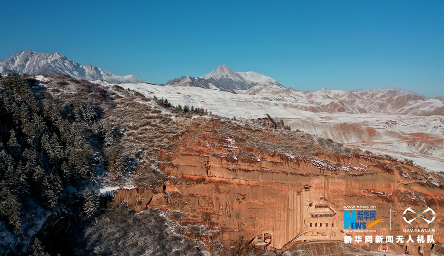 當日,雪霽初晴的甘肅省張掖市肅南裕固族自治縣馬蹄寺風景區(qū),松海翠柏銀裝素裹,與丹霞峭壁上的石窟相互映襯,如一幅美麗畫卷。