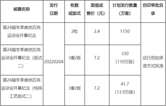 今日,國(guó)家郵政局公布《第24屆冬季奧林匹克運(yùn)動(dòng)會(huì)開(kāi)幕紀(jì)念》紀(jì)念郵票計(jì)劃發(fā)行數(shù)量及仿印審批目錄情況。