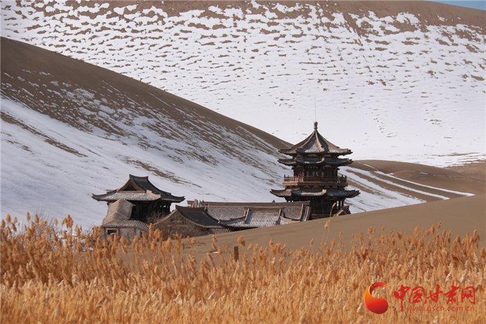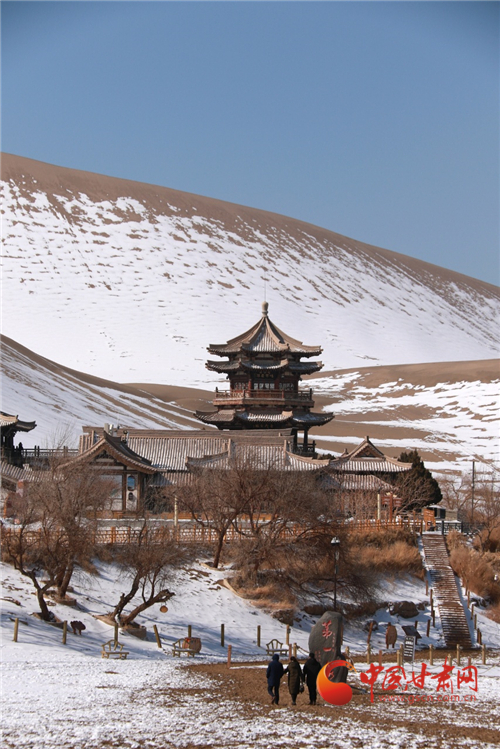 雪后的甘肅省敦煌市鳴沙山月牙泉景區(qū)景色如畫(huà)、銀裝素裹,美不勝收。