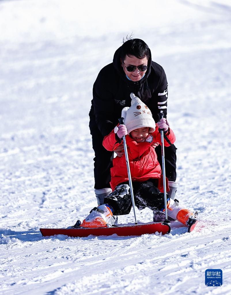 2月19日,在寧夏銀川市閱?;﹫?,一名家長帶著孩子玩耍。