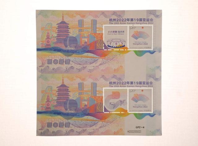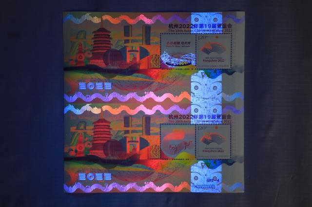 據了解,《杭州2022年第19屆亞運會》特殊版式個性化郵票雙連張是中國集郵有限公司匠心打造的首款GPZ編號體育題材郵票,由青年設計師趙郁竹擔綱設計,限量發(fā)行。它依托杭州亞運會色彩系統和視覺形象元素,融歷史文化、現代美學和未來暢想于一體,集藝術感、科技感和運動感于一身,展現中華文明、浙江風采、杭州韻味和時代魅力,采用特殊版式、編號和工藝,紫光燈下局部呈現無色熒光油墨圖案和全真彩效果,傳遞中國郵政對杭州亞運的美好祝福。(圖片由人民日報客戶端提供)