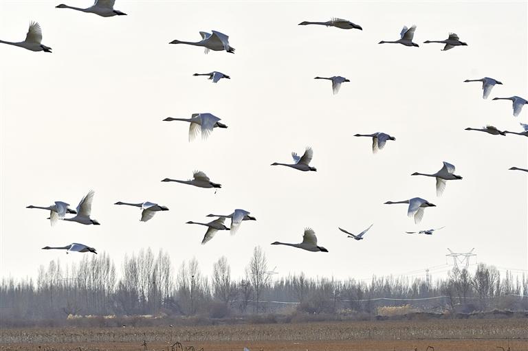 中國甘肅網(wǎng)3月24日訊 據(jù)蘭州晚報報道(通訊員 鄭耀德 記者 雒煥素 攝)3月22日,在張掖黑河濕地國家級自然保護區(qū)臨澤縣鮑家湖濕地內(nèi),大群的野生大天鵝、赤麻鴨、綠頭鴨、灰雁等北遷候鳥嬉戲覓食,黑河濕地迎來了春季候鳥遷徙高峰期。