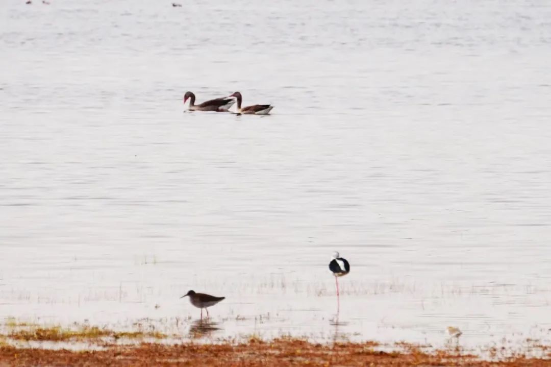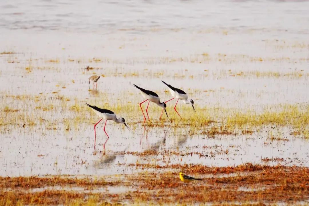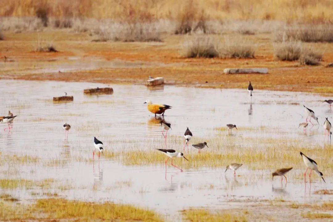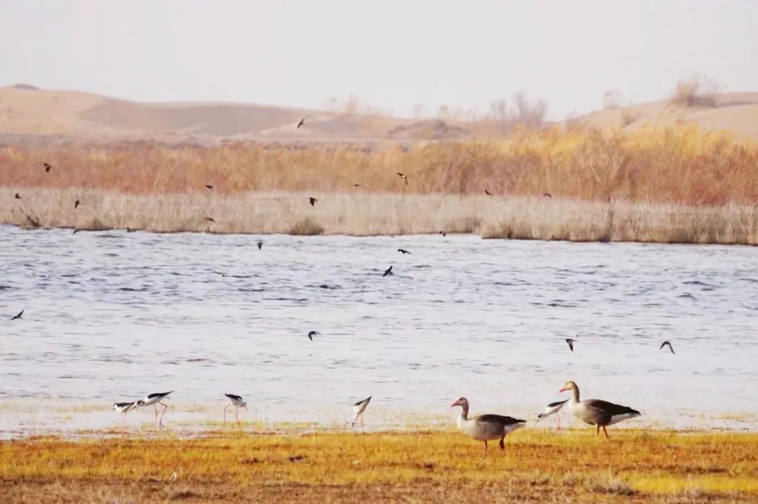 四月的敦煌大地春和景明,在庫(kù)姆塔格沙漠的邊緣,位于陽(yáng)關(guān)濕地的壽昌海子波平如鏡,碧水映襯著祁連山上的雪峰,各種色彩斑斕地鳥兒仿佛收到了春天的邀約,在這里參加一場(chǎng)盛大的聚會(huì)。它們有的在湖面上引頸入水自在覓食,有的踏波翩翩起舞,有的追逐嬉戲鳴唱,有的在岸邊閑庭信步、悠然自得地曬太陽(yáng)......構(gòu)成了一幅多姿多彩的和諧自然生態(tài)畫卷。