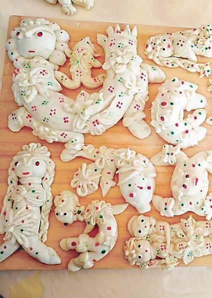 靜寧人的花饃饃,正是應(yīng)和了消病消災(zāi)、祈求平安的民間心理。端午禮儀中的面塑,表達(dá)著人們對(duì)美好事物的向往和祈禱。雖然是以食物的面目出現(xiàn),但那些充滿靈性的造型,卻飽含著人文的意蘊(yùn)。靜寧人塑成動(dòng)物的面花中,最多的是蟾蜍和蛇。蛇面花多是盤(pán)成一團(tuán)的,沒(méi)有攻擊性又溫和的樣子。蟾蜍面花本地人叫“癩呱子”,形象很可愛(ài),多的是兩只后足弧形對(duì)稱(chēng),蜷在腹部?jī)蓚?cè);兩只前足在頭頂相合,呈環(huán)抱姿態(tài)。也有別出心裁的婦女,會(huì)做出十二生肖之類(lèi)的面花,這些面花,修飾并不夸張,其神韻更勝于外在的精致技巧。所有的端午面花都寄寓著大人們的祈福,但孩子們最喜歡的是動(dòng)物面花,古靈精怪的,讓他們舍不得摸,更舍不得吃,只能與荷包一起掛在胸前賞玩,或與鄰家的小孩子一起比,看誰(shuí)的媽媽手更靈更巧。