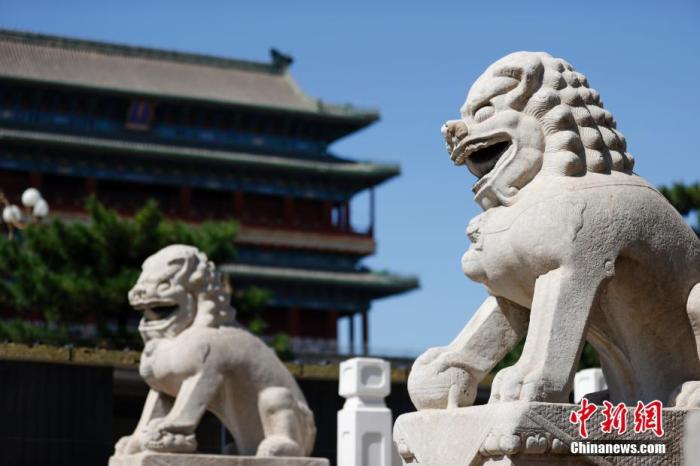 圖為北京正陽門箭樓下的石獅雕塑。中新社記者 富田 攝