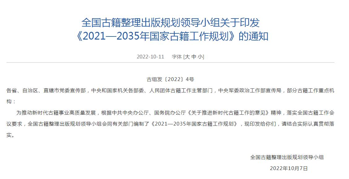 12日,據國家新聞出版署網站消息,全國古籍整理出版規(guī)劃領導小組會同有關部門編制了《2021—2035年國家古籍工作規(guī)劃》,其中提到,至2035年,古籍工作體制機制更加完善,以重大工程為引領,加強古籍工作全局性謀劃,重點實施 《永樂大典》、敦煌文獻系統(tǒng)性保護整理出版工程等。