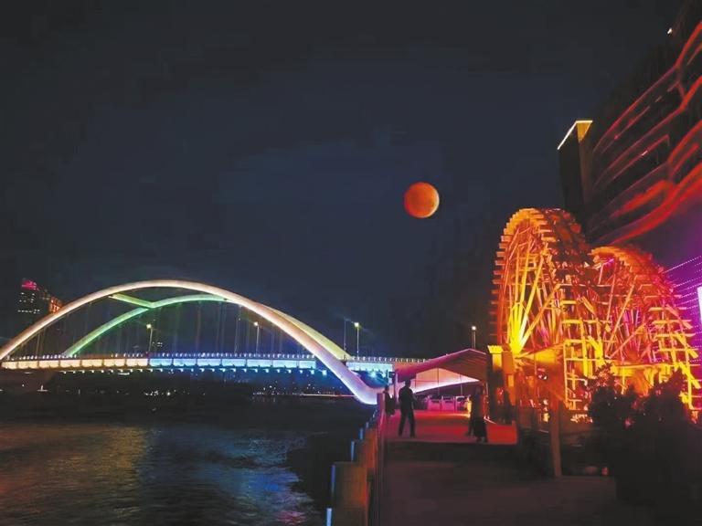 這是11月8日晚網(wǎng)友在蘭州黃河風(fēng)情線拍攝的月食。