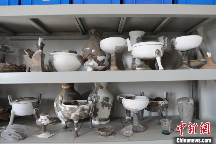 劉勇介紹,考古現(xiàn)場出土的文物碎片,就好比不同的樂高積木混在一起,需要分門別類地梳理出來。每一個編織袋里裝有一件器物,事先已經(jīng)在考古工地現(xiàn)場進行了初步分類,接著就是清洗清理碎片上的泥土,再而拼接、粘接、補石膏、打磨……